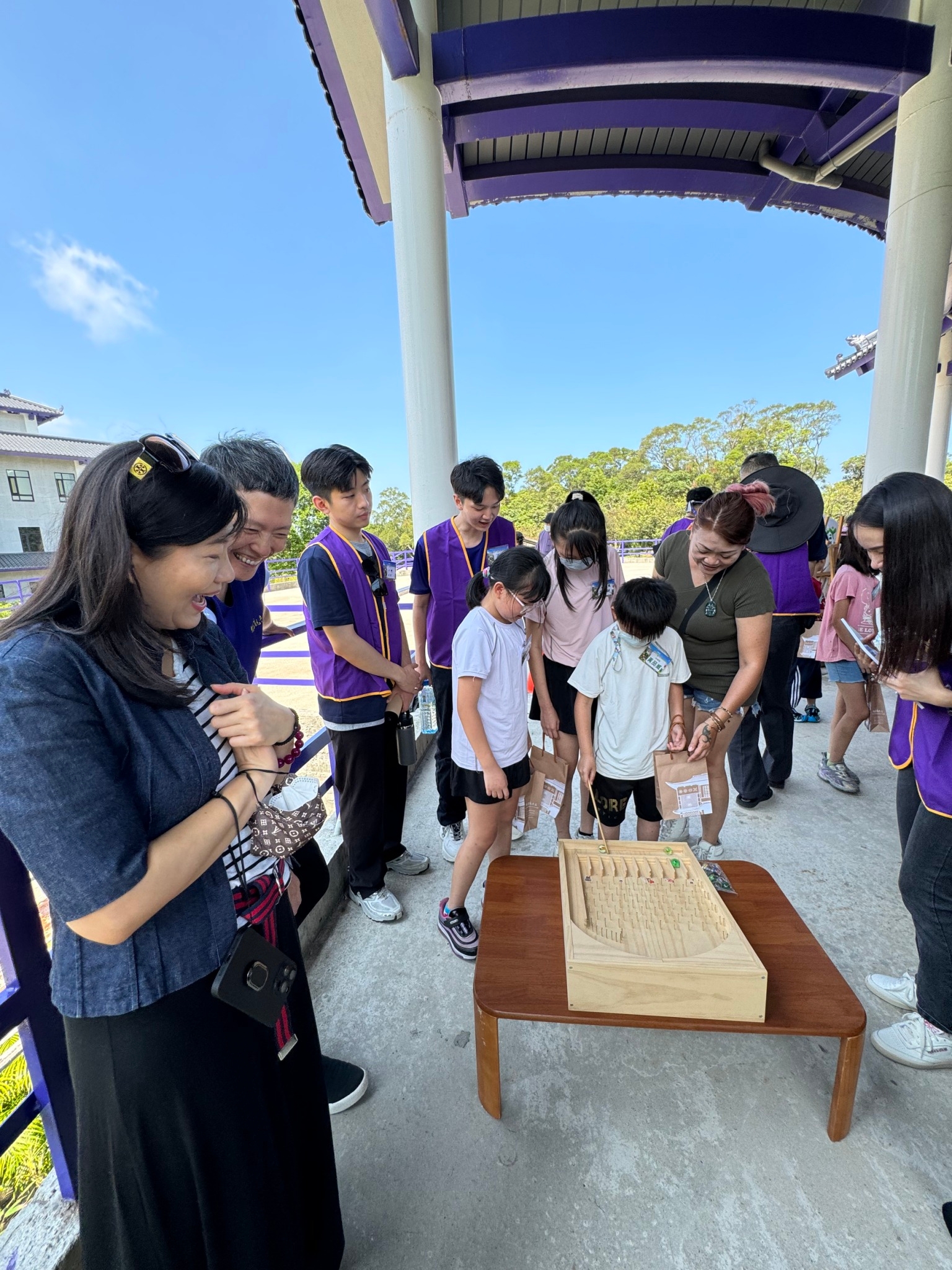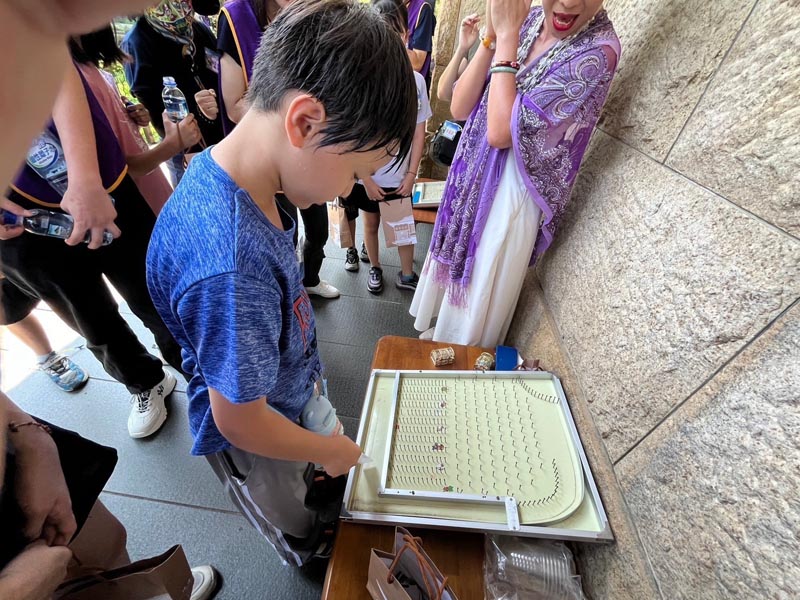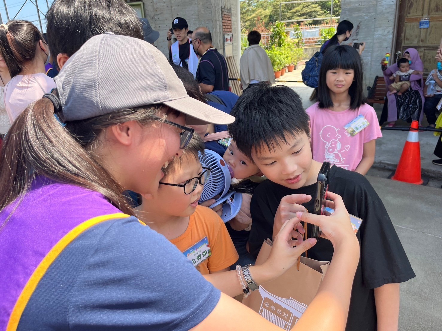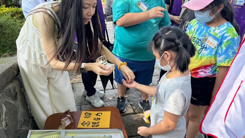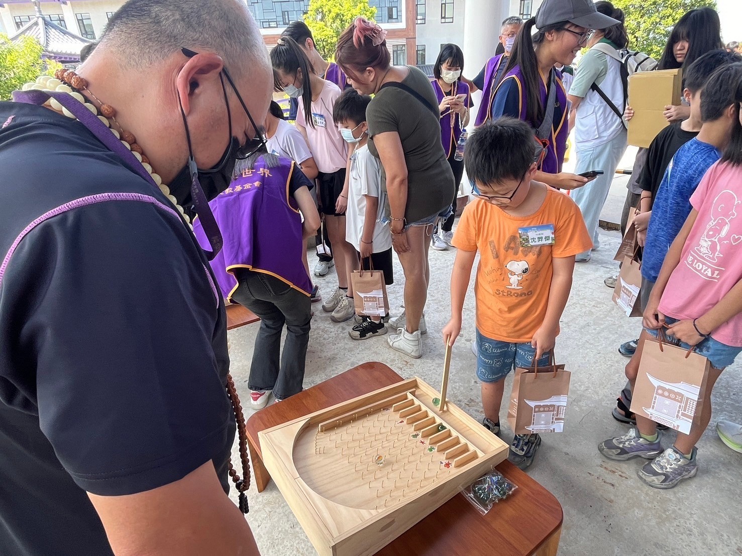 小朋友在祖師廟大殿遇到穿藍覺的義工,只要分享對於金字塔和九宮格的感受,就能從幫助義工獲得能量。