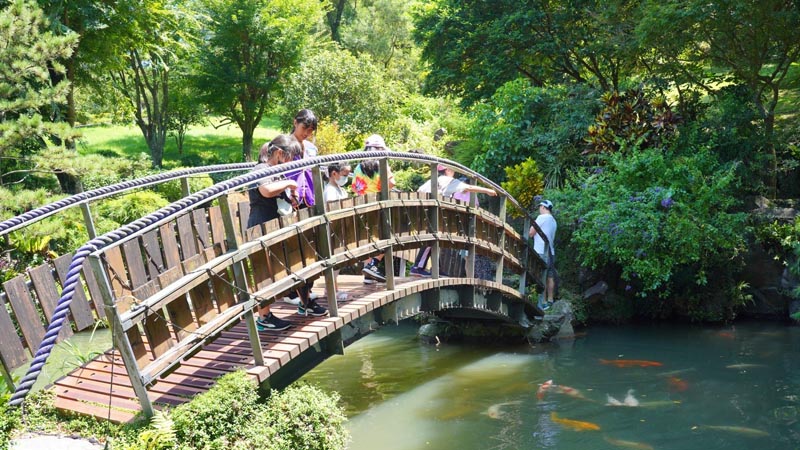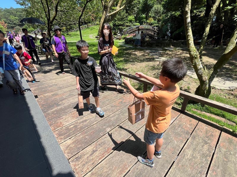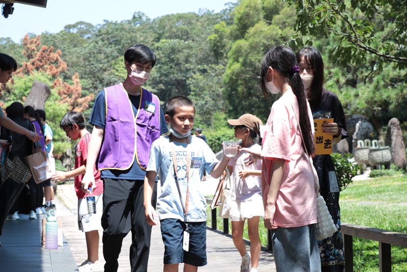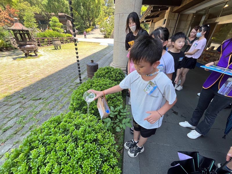 大家一起接力傳遞充滿愛心的水,從極樂開始繞寺一匝,傳給下一位小朋友時,要在心裡默唸「南無本師大自在王佛」, 回到騎龍觀音旁邊澆花。
