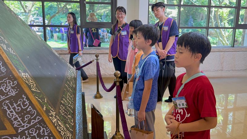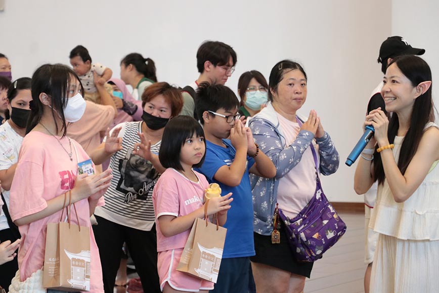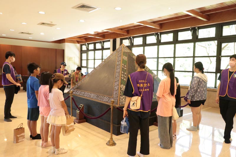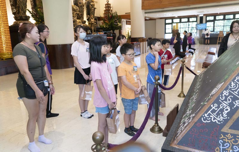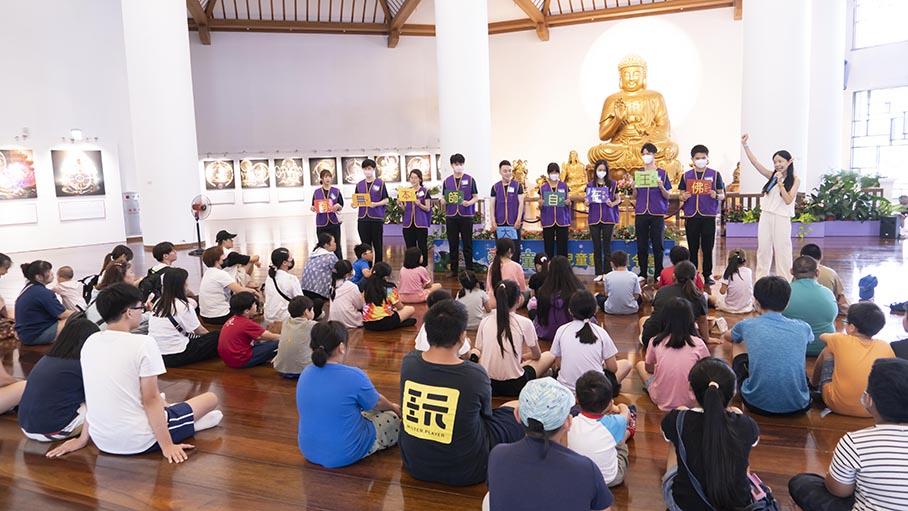 佛乘世界文教基金會副董事長劉梅婷歡迎小朋友,並告訴大家正坐在金氏世界紀錄™認證「最大鋼製雕塑」的「千手千眼觀世音菩薩」聖像下方。