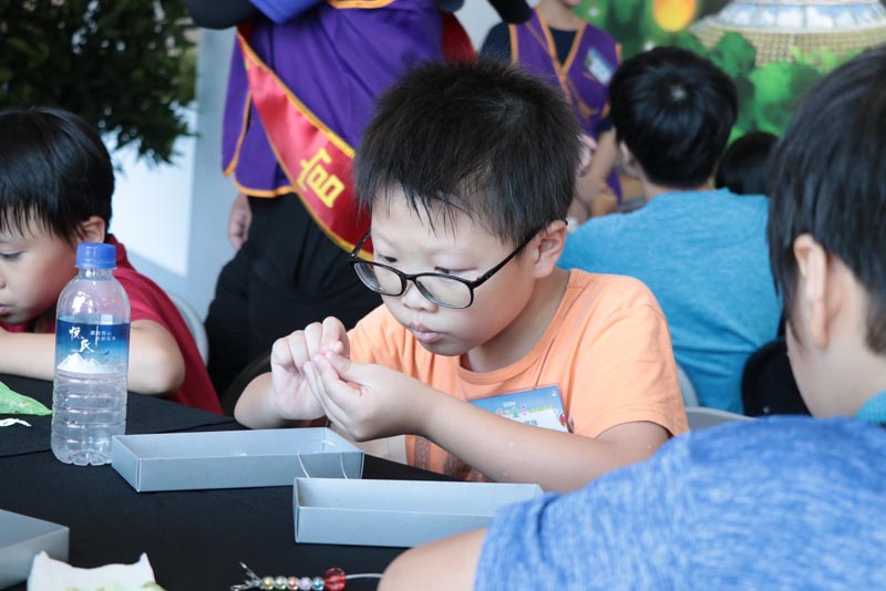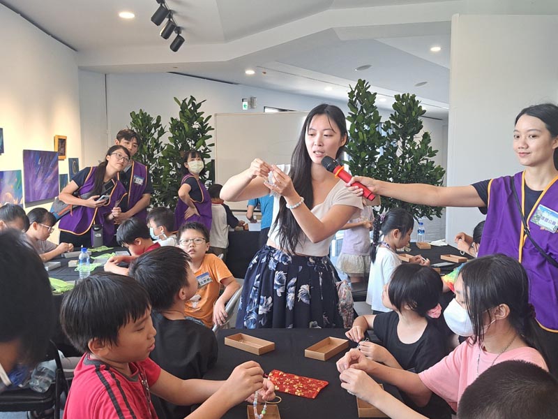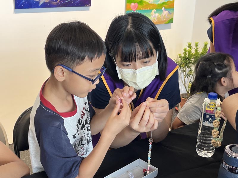 藝術家誼欣Luna老師教導小朋友用上午闖關收集到的珠子,串起自己獨一無二的手珠